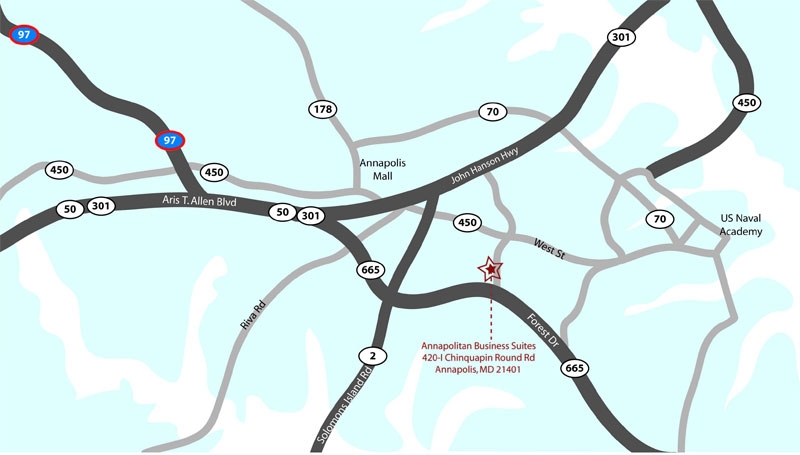 Annapolitan Business Suites is conveniently located in the heart of Annapolis, Maryland. We are: